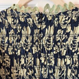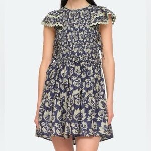 The Linda mini dress features flutter sleeves, ric-rac trim detailing, smocked bodice and side tie detailing.