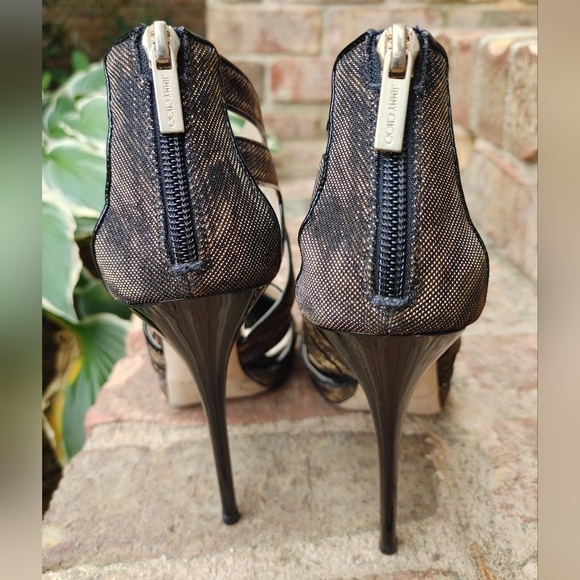 JIMMY CHOO 142 "COLLAR" ZEBRA LAME GLITTER SANDAL, BLACK/AMBER 39
