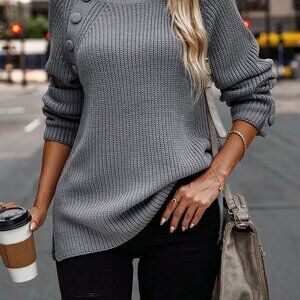 Dark Grey Casual womens Mock Neck Raglan Sleeve Button Detail Sweater