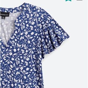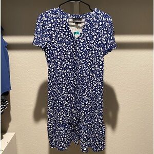 Relaxed fit, 35.5” length, unlined, v neck, dress has stretch