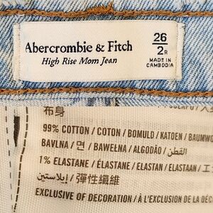 Abercrombie & Fitch High Rise Mom Jean. Light indigo wash. Intentional fading and whiskering. High rise. Tapered straight leg. Cropped length. Factory ripped and distressed details, including knee blowouts and distressing at the hem. Thick denim with a hint of stretch. 5 pockets. Zip fly with button closure. Size 26 / 2 Regular. 99% Cotton, 1% Elastane. In excellent, pre-owned condition. No flaws.