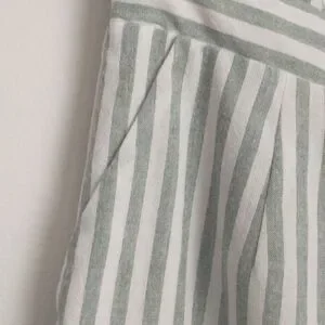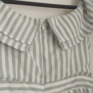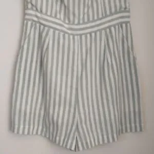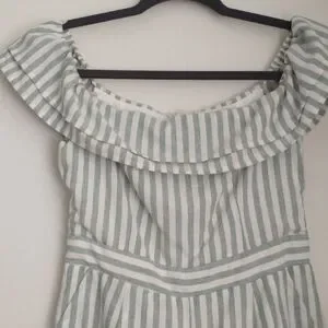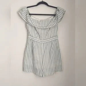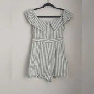 This adorable ruffled neckline romper can be worn on or off shoulder, with. back zip closure and side pockets. It's made of a lined woven cotton chambray material with a sage green striped pattern. This romper is in excellent condition with no visible wear.