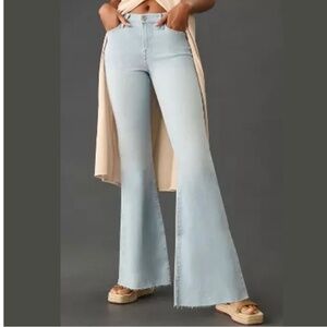 NEW Frame Le Easy Flare Jean in Clarity in size 34. The Le Easy Flare is a new summer icon with high-rise, full length flared leg finished with a raw hem. Done in super stretch denim washed to the palest blue, this relaxed fix is a perfect pairing with leather slides, classic thongs and fisherman sandals all summer long. Brand new with tags, but tags are marked to prevent store return.
