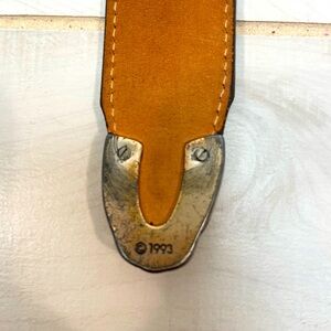 Vintage brown textured leather belt with silver detailing, marked 1993