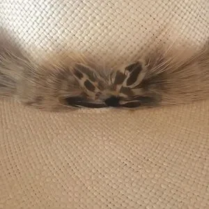 Natural peacock feather hat band. Colors vary from brown and tan. Adjustable with metal prongs. Measures approximately 2" inch wide and 27 1/2" in length.