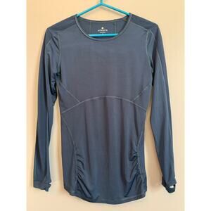 Athleta sculptek fitted dark blue workout shirt. Long sleeved. Sides have ruching toward the bottom. Sleeves have see through mesh going down the top of the arm from neck to wrist. Sleeves have thumb holes.