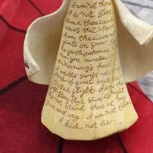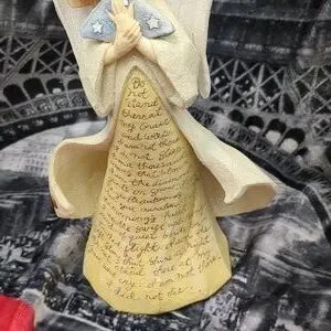 beautiful angel with a purse on it could be for anyone who has passed or a veteran. please note on the back the reference. Made of resin. I personally have the same one lovely verbiage on the front. 2003, this is no longer being manufactured. 9 in tall, approximately 6 in across in the widest part