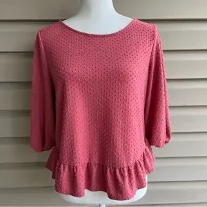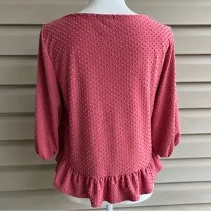 This is a soft three quarter sleeved popover blouse from Anthro’s W5, ladies size Small. The stretchy Swiss fit fabric, 77% polyester/23% rayon, is dusty rose colored. Features a rounded neckline, elastic at the cuff, creating a puffed sleeve, and a ruffle peplum. Pair it with jeans for casual fun, with dress pants for business casual!