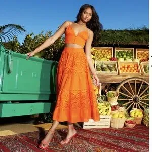This stunning midi skirt includes a bright orange floral eyelet that simultaneously feels bold & timeless. With a pull-on smocked waist, it's also really comfy!