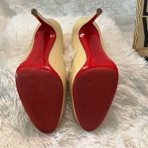 Elevate your shoe game in these platform Christian Louboutin New Simple Pumps which are patent leather pumps in the color bone, which are just perfect dressed up or down - a total classic must-have pump!