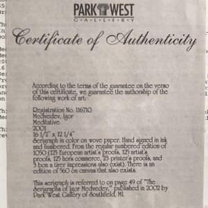 Serigraph in color on wove paper. Hand signed in ink (right corner) and numbered (lower left). From the regular numbered edition of 1050 (125 European artist's proofs, 125 artist's proofs, 125 hors commerce proofs, 23 printer's proofs, and three bon a tirer impressions also exist). There is an addition of 560 on canvas that also exists.