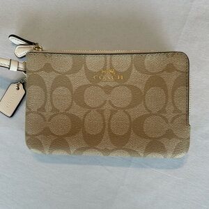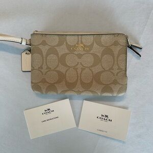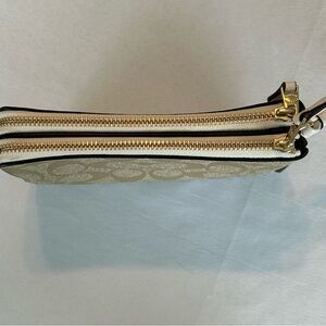 Coach Signature double zip wristlet in tan, white with gold trim 6.25” L x 4” H x 1.25” W. Never used in excellent condition.