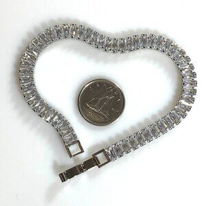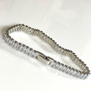 Feel Beautiful Everyday with this spectacular baguette cut Cubic Zirconia stones set side by side in a tennis bracelet. A hinged clasp finishes off this very classic bracelet. Tennis anyone? Measurements: 180 mm / 7" long x 6 mm / 1/4" wide Weight: 7 g Materials: 925 stamped sterling silver with Cubic Zirconia semi-precious stones