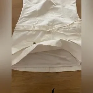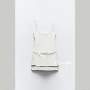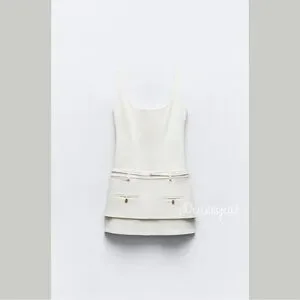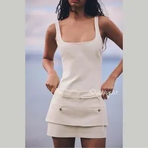 Fitted tank mini dress with squared neckline. Buttoned false welt pockets at front. Thin belt with metal buckle.