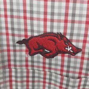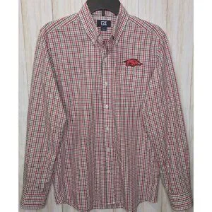 Show your support for the Arkansas Razorback team with this classic Cutter & Buck button-up shirt. Featuring a plaid pattern in the team's colors of red and white, this shirt is perfect for casual occasions. The long sleeve and button-down collar style make it suitable for any season. This shirt is a size small and looks new, so it is in excellent condition. With embroidered accents and a classic fit, it is sure to become a favorite in your wardrobe. Whether you're a student, alumni, or just a fan of the team, this shirt is a great way to show your Razorback pride.