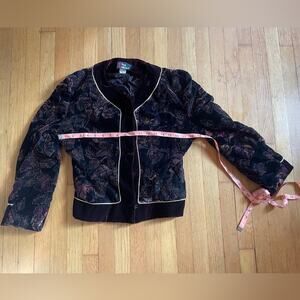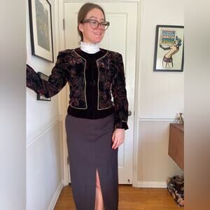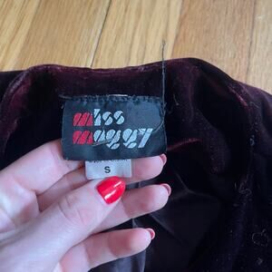 A cute 1990s vintage velvet blazer / jacket. It’s got a high neckline and long sleeves and closes down the front with velcro closures. The velvet is two toned - the primary fabric is a reddish black with a leaf pattern in a slightly metallic red and gold color. The jacket has gold piping along the neckline and front - the areas that are not covered in leaves are a solid red black velvet. The brand is miss maggy and it’s a size small with measurements in photos. In good vintage condition - it looks like it may have had a front button - there are loose threads remaining in its place. Velcro closures are getting tired.