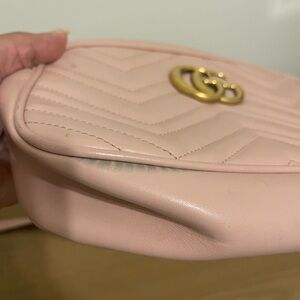 100% Authentic GUCCI GG Marmont Pink Leather Shoulder Bag with gold accent