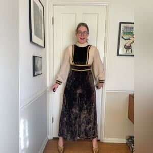Beautiful 1970s vintage velvet jumpsuit made by Sandine originals. The body of the jumpsuit is made of brown velvet - it has a bib style top with a cream chiffon long sleeve top attached underneath. There is gold banding at the waist and up the front. the top has slightly sheer puffed sleeves and are banded at the wrist with brown velvet and gold trim, also has a turtleneck collar. Zips up the back. No size tag - see measurements in photos - approximately a size small. Has a few minor flaws - there is a pinhole under the fold of the collar, and a few small spots on the chiffon near the shoulder. The perfect holiday hostess outfit!
