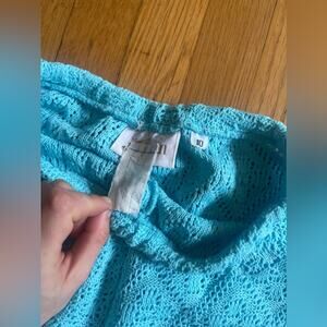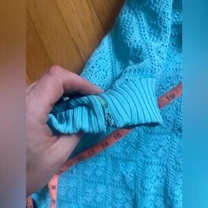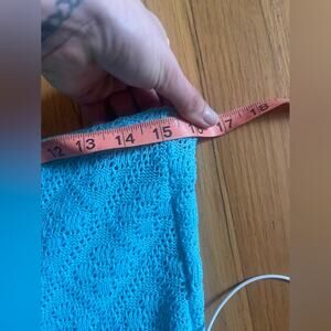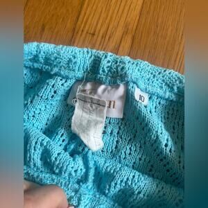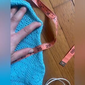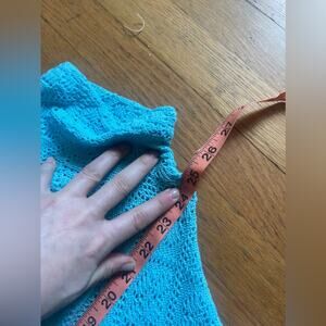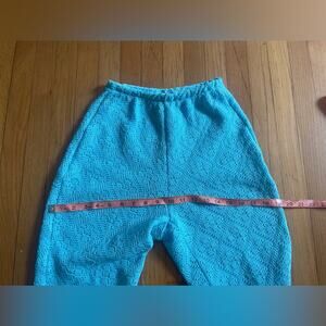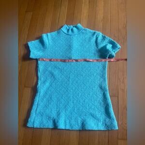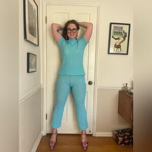 This knit suit is fantastic! Circa 1970s and made by Jantzen, it’s an acrylic knit two piece pantsuit in a vibrant light blue color. It is short sleeved and has a mock neck collar. The pants are high waisted and kick flare style. Both the top and the bottom are slightly sheer due to the knit pattern- would make a great swimsuit coverup! Marked a vintage 10 with measurements in photos - both min and max are included. Approx a small to medium. Overall in good vintage condition with a couple minor pulls.