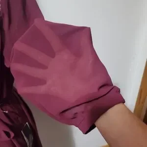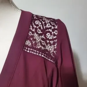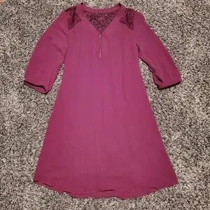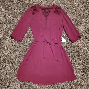 A charming knee-length dress with a matching belt/waist tie. Can be worn with or without the belt. This dress features a V-neck with a front zipper; lace panels at the shoulders; long, see-through sleeves; and a button closure at each cuff. It is fully lined.