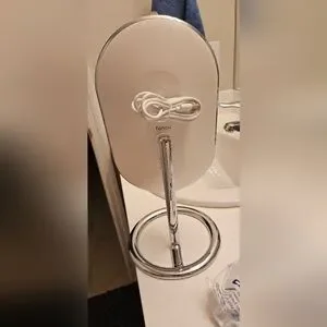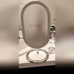 A gorgeous sleek finish and large oval mirror. In addition to a heavy, non-slip base and a 45-degree tilt, she has three dimmable LED light settings and a 30-min auto-shutoff.