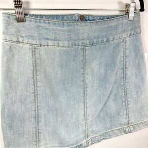 Create a statement with this trendy Free People denim mini skirt. Its light blue hue with a faded wash adds a vintage touch to any outfit. The cotton material promises comfort and durability, making it perfect for everyday wear.