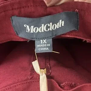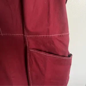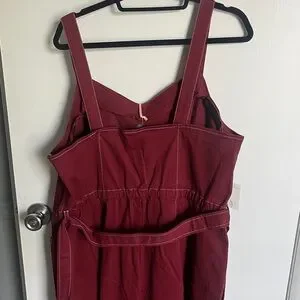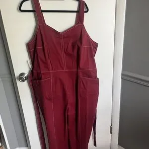 Burgundy jumpsuit with adjustable straps, pockets, and zipper closure. Tie around waist.