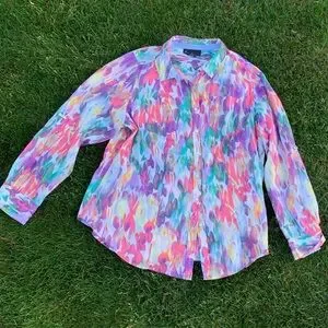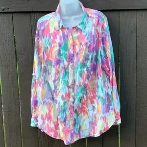 Beautiful long sleeve button down cotton blouse 14/16. Tab detail on sleeve. Lightweight and soft. Front pockets. Princess seams. Chest measured flat underarm to underarm 24-1/2. Sleeve length 25. Front length 27”. Waist measured flat 23-1/2. . Non smoking home, fast shipper, 5 star seller.