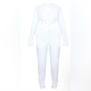 We are loving this jumpsuit for your weekend wardrobe. Featuring a white material with a zip fastening, a corset waist detail and a tailored fit. Style this with barely-there heels and simple accessories to complete the look.