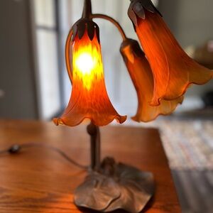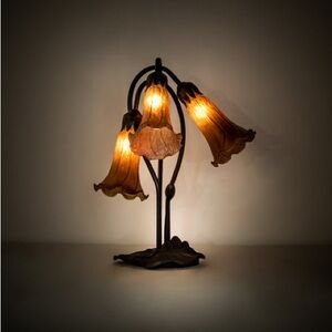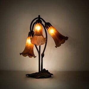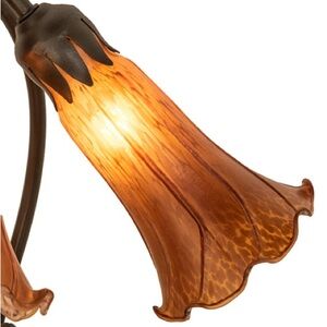 Inspired by Tiffany's famous Pond Lily design from the early 1900s. This table lamp is created with three mouth blown shades featuring Amber art glass. The Pond Lily shades are embraced by an elegant Cast Metal Base featuring a Mahogany Bronze finish. Each shade is a unique work of art with color variations based on natural ingredients inherent in the glass.