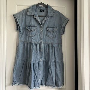 Button down (snaps), jean dress from Vici. Has frayed edges. Only worn one time, in great condition.