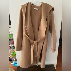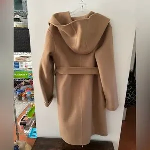 Gorgeous camel coat with hood and tie closure. Wrap design. Unlined but warm, was a gift so I’m not sure of fabric content but I believe it’s wool. Tag does not state.