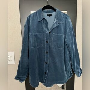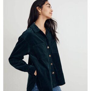 Crafted from touchable corduroy, this oversized shacket has flap patch pockets and a curved shirttail hem. The perfect throw-on-easy layer.
