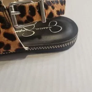 This is a Jessica Simpson Braelyn flat sandal in leopard print with rhinestone accents, size 7. It has an adjustable buckle closure and is made of lightweight leather. The sandal is suitable for various occasions, including activewear, party/cocktail, casual, and business. The flat heel is less than 1 inch, and the shoe is standard width. The sandal is perfect for the summer and spring seasons and has a nature/animal/safari theme. Shoes are in v3ry good pre-owned condition. Please see photos.