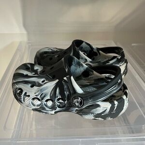 Gently worn marbled black and white crocs, toddler/kids sz 10. Lots of kids shoes, nice Nikes, bundle & save see closet!