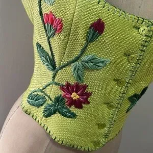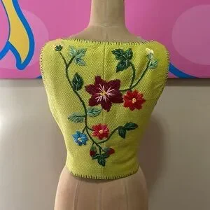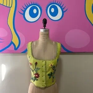 Be Retro cool wearing this vintage green bustier with embroidered flowers by Moschino! Pair with high waist white jeans or mini skirt for a finished look.