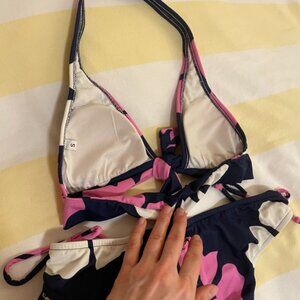 Excellent condition Roxy bikini in navy and pink hibiscus floral print. This is near-vintage or vintage because of the "Roxy Quiksilver" logo on the tag. Roxy dropped the "Quiksilver" in the late 90s/early 2000s. This is highly likely a nylon/lycra blend because that was the primary (if not the only) material used for swimsuits of that time period. Nylon is better than polyester because its a much more durable fabric. Colours are vibrant - there doesn't appear to be any chlorine-induced fading. Elastic in material is very stretchy and resilient. Very clean inside. No snags to material. No stains, no odours. Comes from non-smoking, no-pet home.