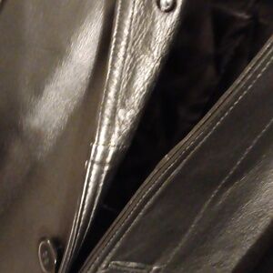 Beautiful 100% leather jacket. Quilted lining. Inside breast pocket. Blazer style. Back slit. Button closure. Flap pockets.