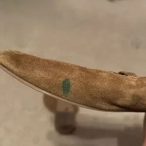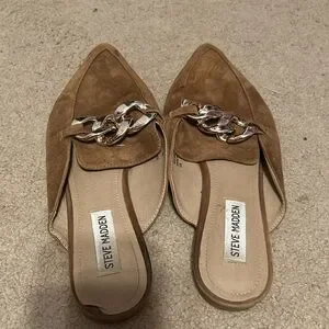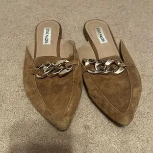 Brown Steve Madden Loafers. Gold chain link on top. There is a small ink stain on one shoe, it is pictured. It’s barely noticeable when you are wearing them. Size 9.