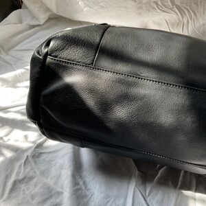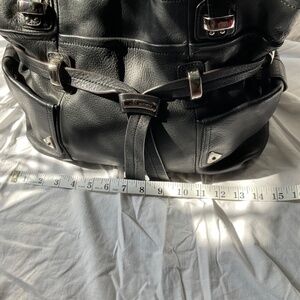 Oversized tote with silver hardware and many pockets, some with zipper closures.