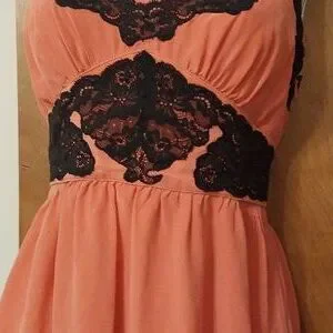 salmon pink with black lace detailing. fully lined in nylon.