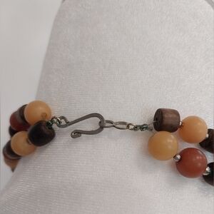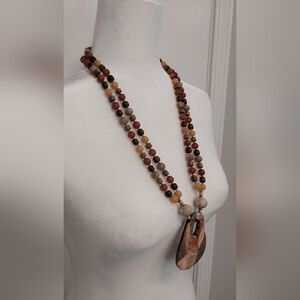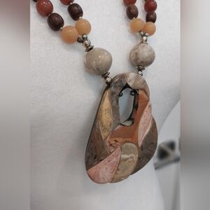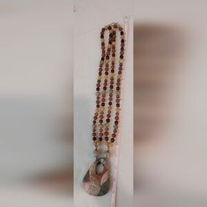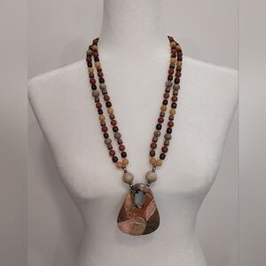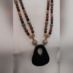 It is a beautiful two double-strand beaded necklace with a large geometric pendant. The beads are stone and wood, with small round silver tone spacer beads. The pendant has a black acrylic or lucite backing with stone inlay. Hook clasp.