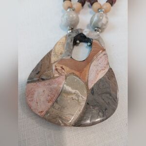 Vintage Stone and Wood Beaded Necklace Geometric Inlay Pendant Neutral Colors