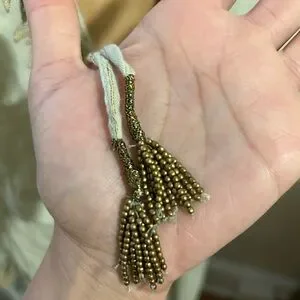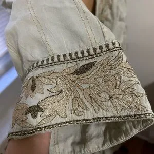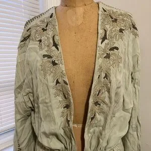Has a beautiful gold embroidered design. Color of the fabric is a light mint green.