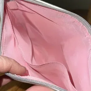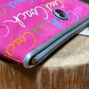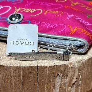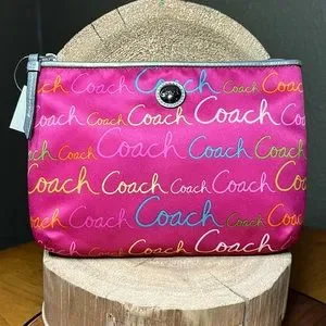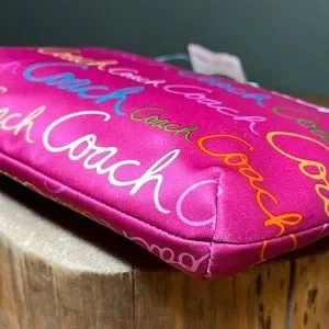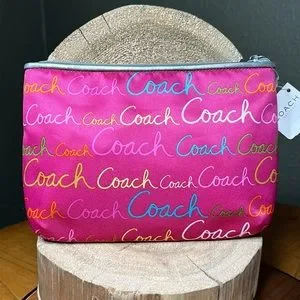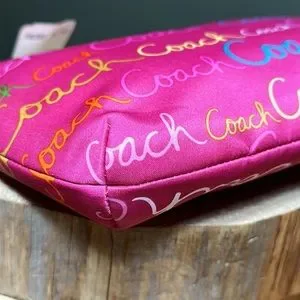 NWT and very rare. This Coach Script Large Chubby can be used as a makeup bag, clutch or travel bag. Hot pink with multicolor Coach script. Silver metallic leather trim and hardware. Interior pink sateen is perfect with 1 main section and one large open pocket. Two small marks from storage shown in last picture. Size 9 1/4” x 6 1/2” x 1”.