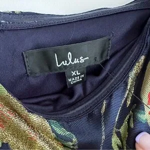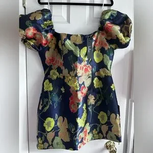 Stunning Navy Blue Floral Jacquard Puff Sleeve Mini Dress! Medium-weight jacquard fabric, with a colorful floral design and metallic lurex threading, shapes this glam dress that has a square neckline and puffy short sleeves with elastic at the shoulders and cuffs. A princess-seamed bodice tops an A-line mini skirt to complete the look. No-slip strips. Hidden back zipper/clasp.