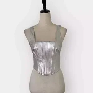 Super cute silver corset top. Very flattering and great for a night out. Sizing runs small.
