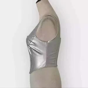 NWOT Japna Metallic Silver Zip Up Corset Faux Leather Crop Bustier Sz S