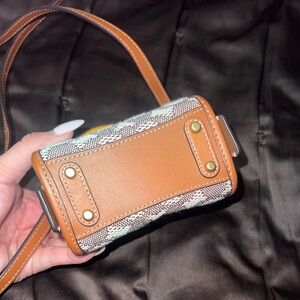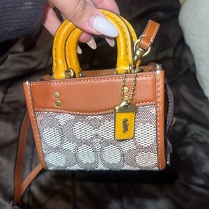 Mini coach bag with detachable leather strap used for crossbody wear. The strap is adjustable. There is card holders inside the purse with a zipper to secure. Work once and in perfect condition.