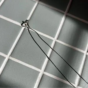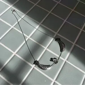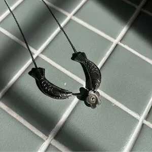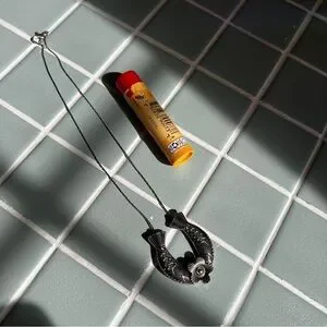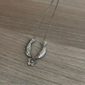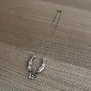 A beautiful necklace. Silver. 2 fish and a flower charm. A little black rust on the chain as pictured. Chapstick for scale only.